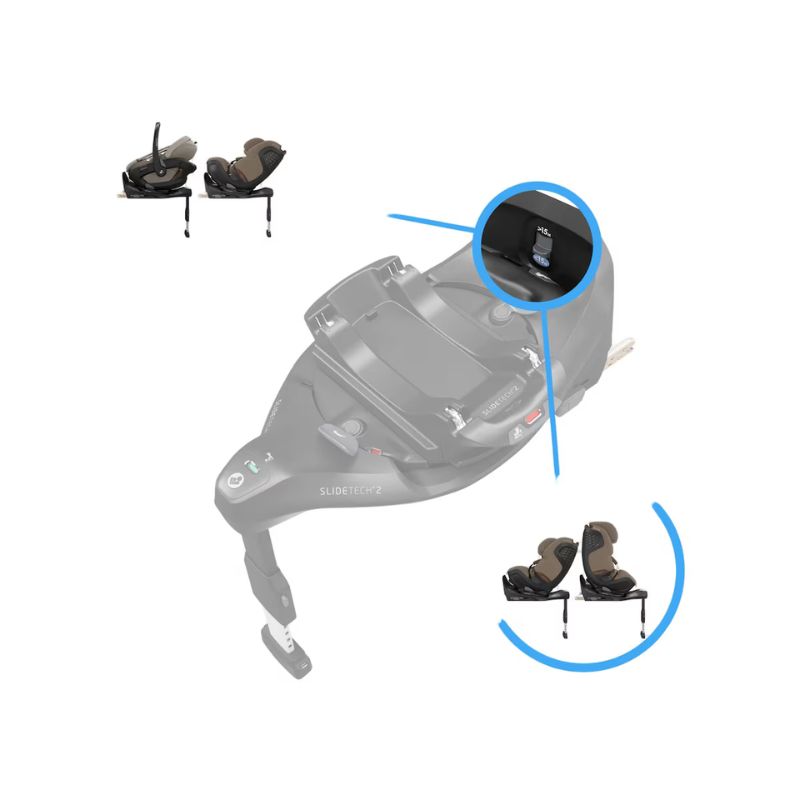 • Rotação suave com uma só mão e SLIDETECH®2, que permite que a cadeira deslize para fora até 27 cm num ângulo amplo e se adapte a qualquer automóvel, independentemente do formato do arco da roda