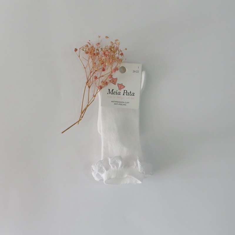 Meia lisa pelo joelho branco com bordado ingles da Meia Pata