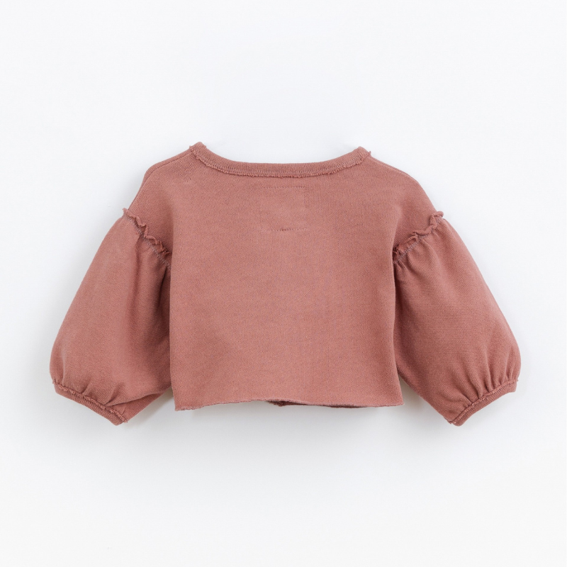 Este casaco é feito em malha com mistura de algodão orgânico e algodão reciclado, na cor Red Clay. É um modelo com decote em V, tem abertura frontal com botões de madeira, dois bolsos à frente e mangas largas com franzido nos punhos. Todas as matérias primas utilizadas nesta peça têm certificação Standard 100 by OEKO-TEX, o que a torna livre de substâncias nocivas para a pele das crianças.