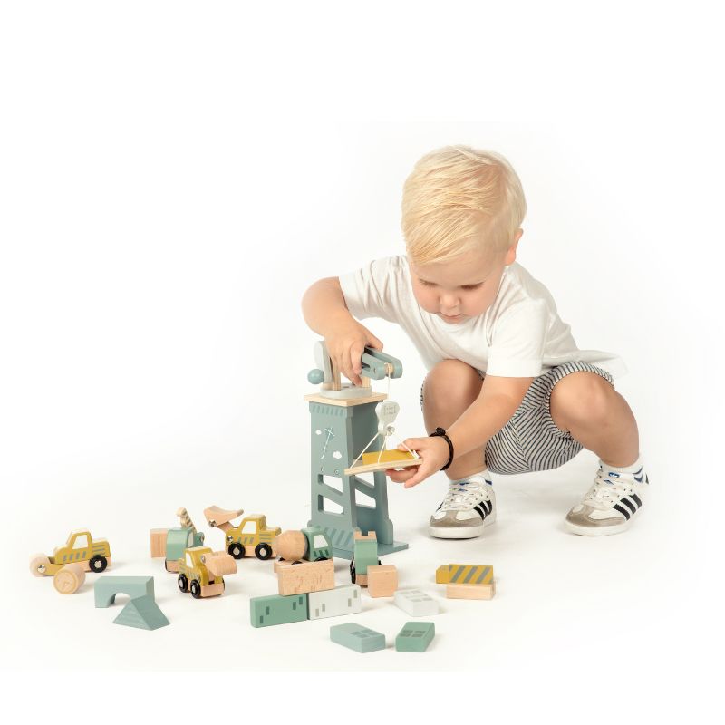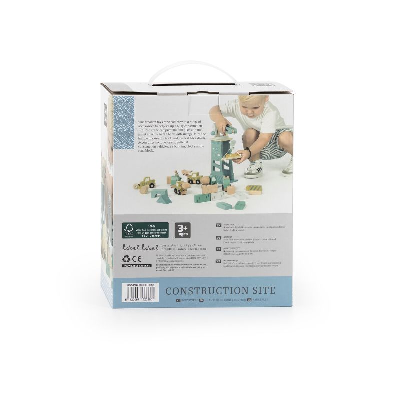 O espaço de brincadeira do seu pequeno transforma-se num verdadeiro canteiro de obras com este fabuloso guindaste de madeira e acessórios. Este canteiro de obras da Label Label é feito de madeira de alta qualidade certificada pelo FSC e decorado com lindas cores usando tinta à base de água, amiga das crianças. Todos os trabalhadores da construção civil em ascensão ficarão nas nuvens! Levantar e mover materiais com o guindaste, construir ou demolir casas, fornecer e remover materiais com camiões... Brincar ganhará uma dimensão totalmente nova. Seu pequeno se tornará um gerente de obra e deixará sua imaginação correr solta em novos projetos. Ao brincar com os 6 camiões, o seu filho dominará as diferentes técnicas de construção. Ao girar a manivela da polia, todos os blocos de construção pesados são levantados. O guindaste pode girar 360° para poder colocar tudo no lugar certo. Tudo muito movimentado...Além de brincar e construir, as crianças estimularão sua criatividade, imaginação e coordenação motora. Dica: com o conjunto de blocos de madeira Label Label você cria ainda mais diversão construindo!