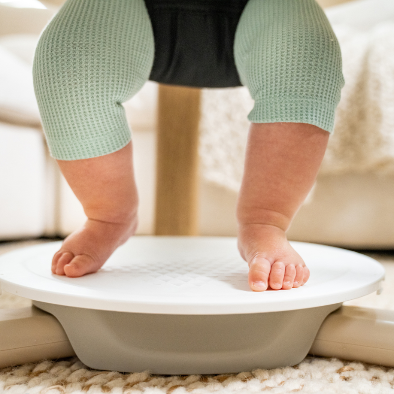 - Quando os bebés se sentarem de forma independente (por volta dos seis meses), pode começar a deixá-los sentar-se no centro de atividades e desfrutar da prancha de equilíbrio anexa para fortalecer as pernas e explorar várias sensações e texturas com os pés.