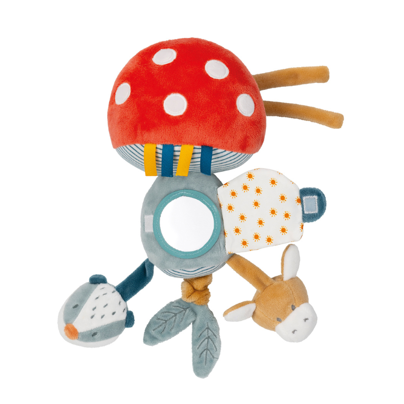 Este lindo brinquedo fofinho com atividades de cogumelo e vários brinquedos proporciona ao seu bebé horas de brincadeira! Atividades divertidas como o peluche Felix texugo com um guincho incorporado, o peluche Leo burro com chocalho, o cogumelo vibratório com sinos, um espelho e muitas etiquetas incentivam o seu bebé a descobrir e agarrar os brinquedos. Desta forma, os reflexos de preensão e o desenvolvimento motor do seu filho são estimulados através da brincadeira. A pelagem macia do cogumelo proporciona uma sensação segura e reconfortante. Um fiel companheiro de brincadeira que traz alegria e conforto desde o nascimento, além de uma ótima ideia de presente para o seu bebé.