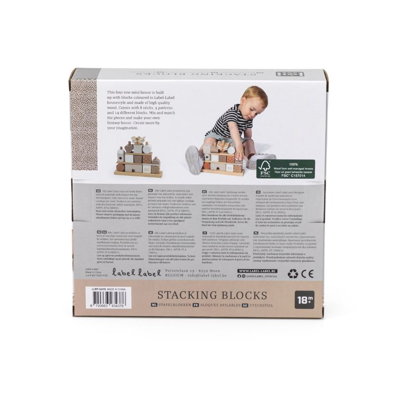 Estes blocos de empilhamento Label Label são feitos de madeira de faia de alta qualidade certificada pelo FSC e foram decorados usando tinta à base de água para crianças. Esta mini casa é composta por 4 filas de blocos de madeira no estilo Label Label. No total, há a base, 8 palitos de madeira, 3 placas de base e 14 blocos em diferentes formas e com diferentes tons de cores, símbolos e padrões com os quais seu filho pode construir sua própria casa de fantasia. Seu filho praticará suas habilidades motoras finas de uma forma lúdica, mas também a fantasia, a engenhosidade e a percepção espacial serão estimuladas.