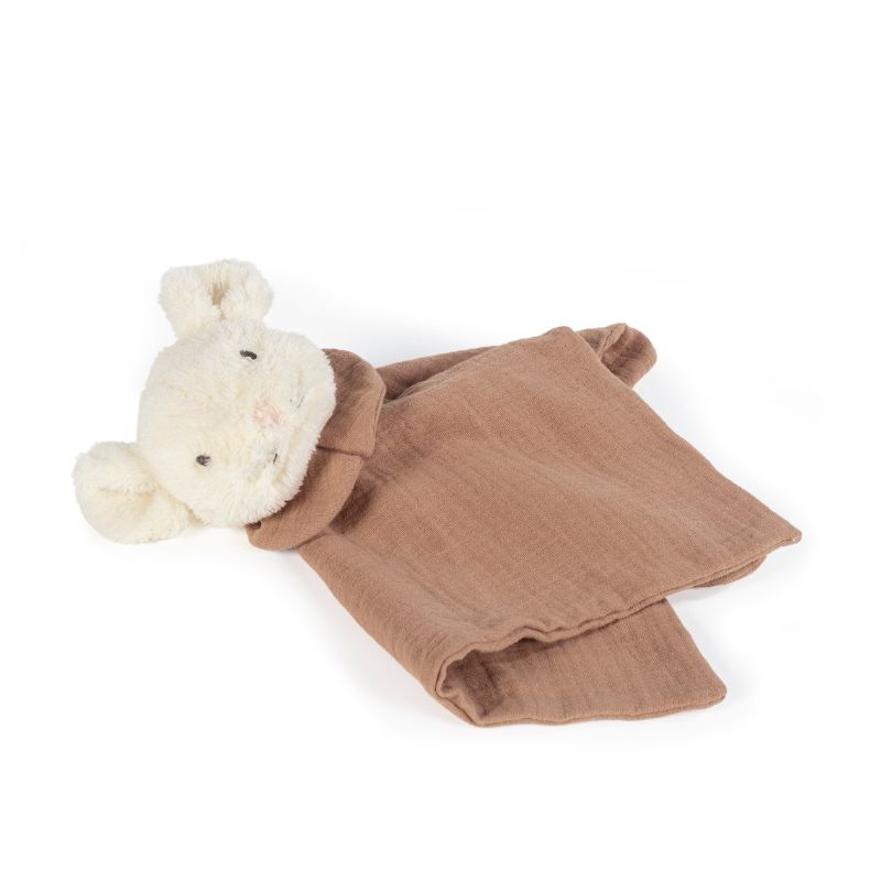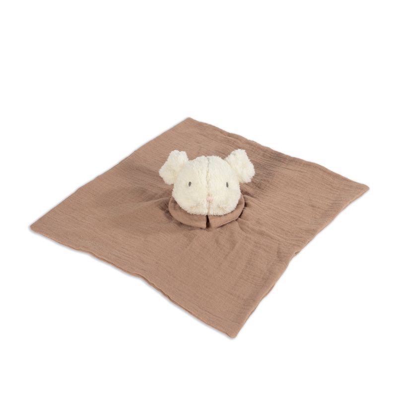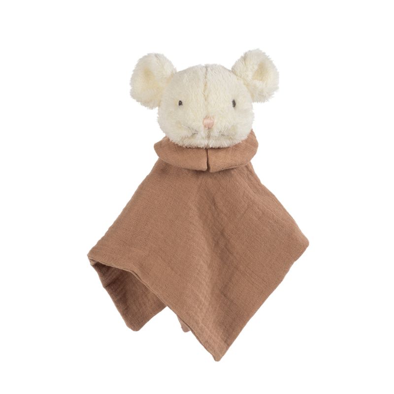 Doudou de rato de pelúcia em musselina. Ajuda a relaxar o bebé quando tocado. Fabricado de acordo com os regulamentos de segurança de brinquedos EN-71.