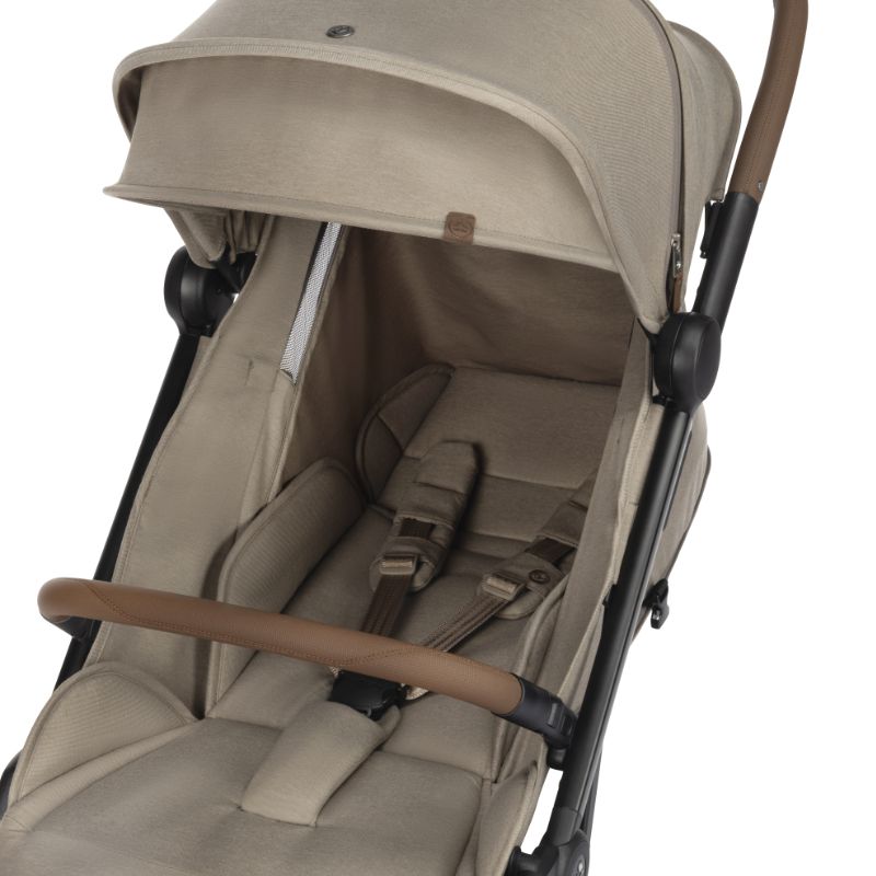 Fecho instantâneo com apenas uma mão Ultracompacto Mantém-se na vertical quando fechado Assento acolchoado e espaçoso com reclinação ergonómica totalmente deitada para utilizar desde o nascimento 3 posições de reclinação Janela de ventilação Capota de sol extensível com proteção UV50+