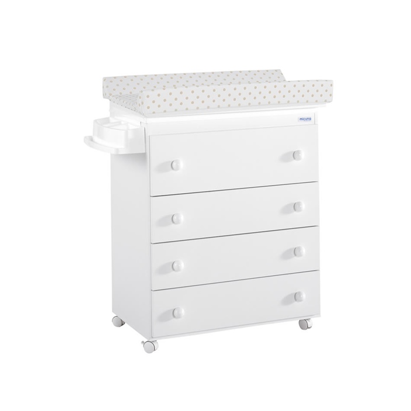 A banheira micuna Basic Line destaca-se por as suas linhas retas e versatilidade. Está disponível em branco, com possibilidade de escolha do mudador de plástico com estrelas cinzentas ou bolinhas bege. Dentro, tem uma banheira confortável com saboneteira e ralo.Possui rodas embutidas, para facilitar sua mobilidade. Graças ao seu complemento de perna fixa opcional, pode ser transformada numa prática e confortável cómoda, eliminando as rodas, a banheira e o mudador.
