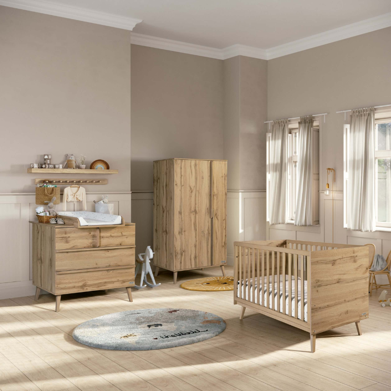 Com a coleção Martha de Micuna , a natureza entra no quarto do bebé, espalhando um ambiente macio, aconchegante e protetor ao seu filho e ao meio ambiente. Cada peça de mobiliário é, de facto, fabricada em Espanha, com madeira proveniente de florestas exploradas de forma sustentável. O roupeiro Martha é composto por 2 portas e 6 prateleiras. Inclui sistema Soft Closing e cabideiro. O acabamento Oak da coleção Martha proporciona robustez, qualidade e segurança para sua tranquilidade e a do seu bebé.