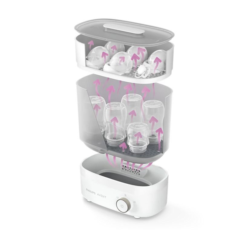 Esteja a postos para a próxima refeição do bebé em 40 minutos. O Esterilizador de biberões e o Secador de alta qualidade utiliza jatos de ar filtrado para secar os biberões antes de desligar. O esterilizador é rápido e higiénico, eliminando 99,9% dos germes* para maior tranquilidade em todas as refeições.