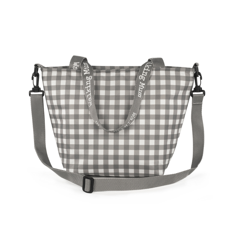 A bolsa térmica Caetana mantém a temperatura por 4 horas. Vem com uma alça longa para pendurá-la no ombro e uma alça curta para carregá-la na mão.