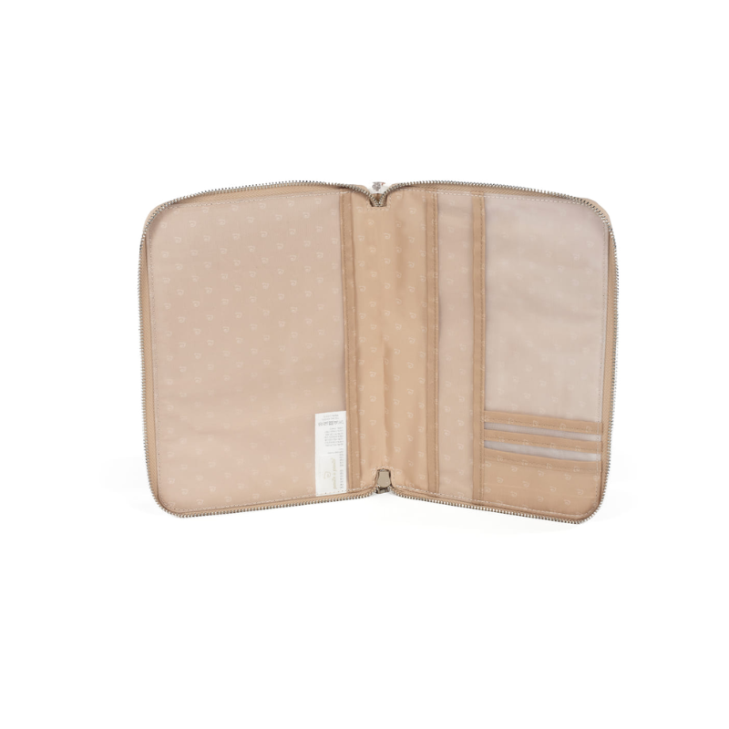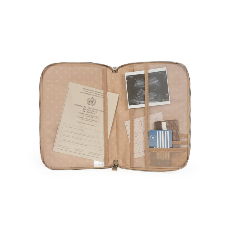 Este moderno e lindo porta-documentos é um acessório essencial para levar consigo para todo o lado e que o ajudará a manter organizada toda a documentação médica e papéis do seu bebé. Este livro porta-documentos é feito de couro sintético durável e macio, tem bolsos em cada lado e é forrado por dentro. Possui um prático fecho para guardar tudo com segurança.