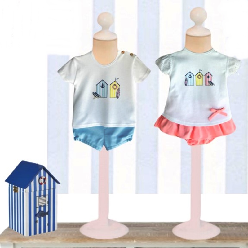 Conjunto com t-Shirt estampada e tapa fraldas com folho, para menina. Para menino, t-shirt estampada e calção azul.