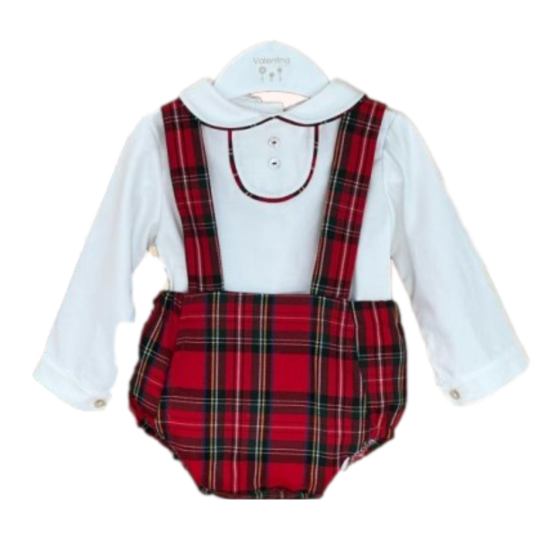 Conjunto de roupa da coleção Outono/Inverno da marca Valentina Bebes. Camisa branca de gola de manga comprida com debrum de xadrez vermelho por baixo de tapa fraldas de xadrez vermelho com alças.