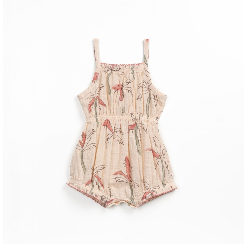 Macacão em algodão com estampado de palmeiras. Alças e elástico franzido no peito e cinta e entre pernas com molas de metal sem níquel.
