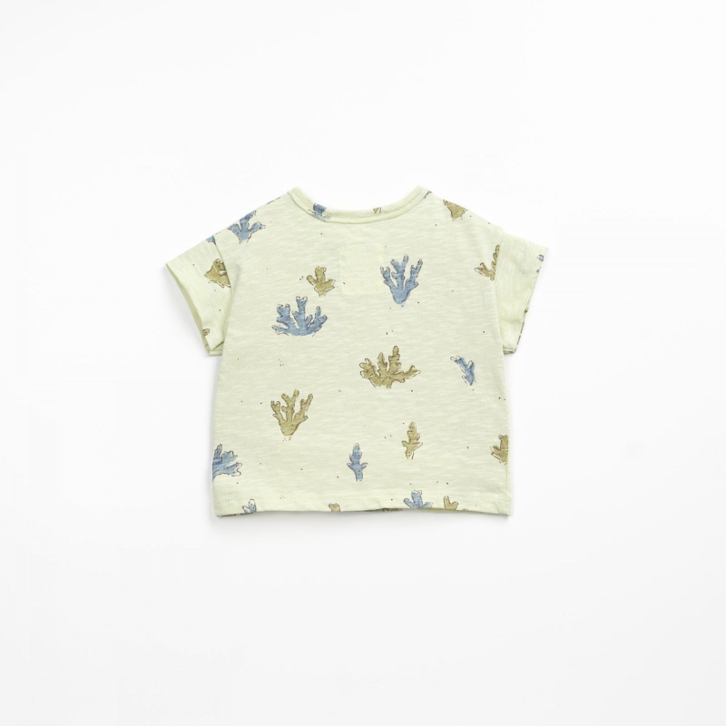 T-shirt de algodão orgânico com manga curta, decote redondo e abertura frontal com botões de coco.