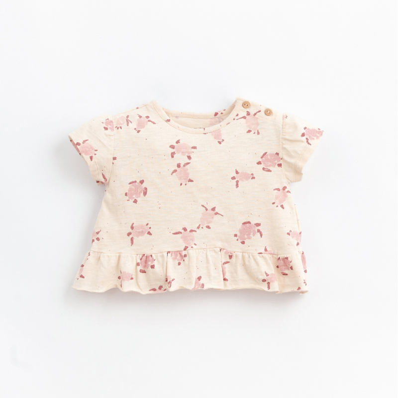 Esta t-shirt é feita em malha de algodão orgânico, na cor Reed. É um modelo com decote redondo e manga curta, tem abertura no ombro com botões de madeira, trespasse nas costas, encaixe de folho no fundo e o nosso estampado de tartarugas. Todas as matérias primas utilizadas nesta peça têm certificação Standard 100 by OEKO-TEX, o que a torna livre de substâncias nocivas para a pele das crianças.