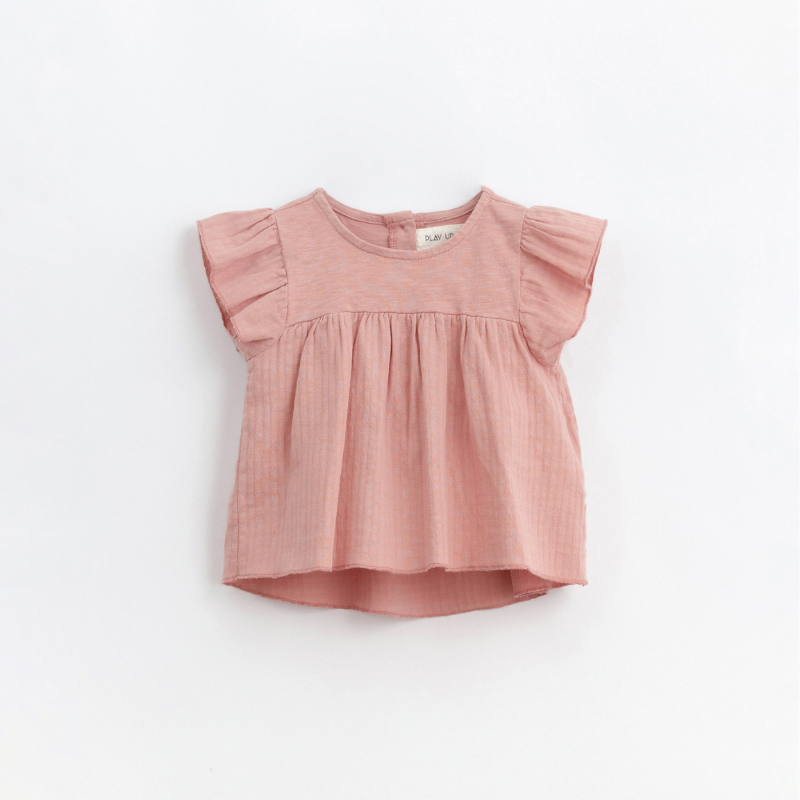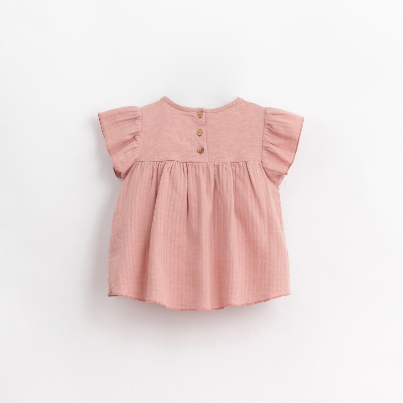 Esta túnica é feita com mistura de tecido em algodão e malha em algodão orgânico. É um modelo com decote redondo, tem abertura nas costas com botões de madeira e aplicação e folho nos ombros. Todas as matérias primas utilizadas nesta peça têm certificação Standard 100 by OEKO-TEX, o que a torna livre de substâncias nocivas para a pele das crianças.
