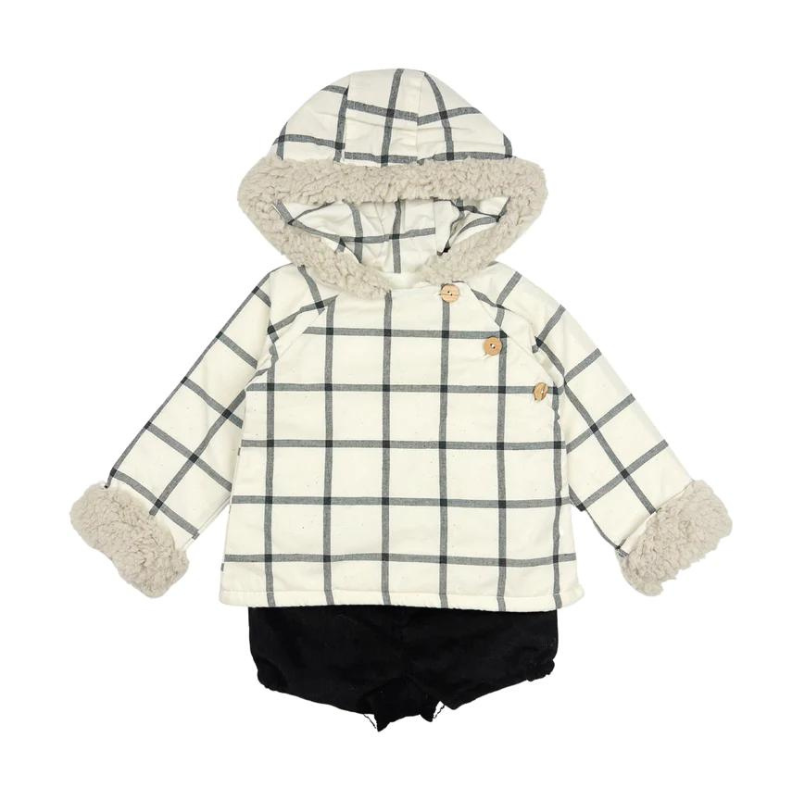 Conjunto da coleção Outono/Inverno da marca Valentina Bebes. Camisola com capuz xadrez grosso em bege e cinza carvão com acabamentos em sherpa macio e forro de lã super confortável para maior aquecimento, combinado com calção de bombazine.
