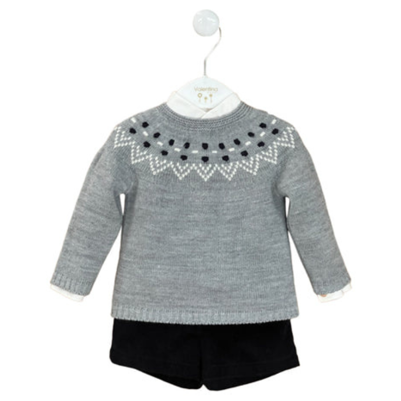 Conjunto para bebé menino da coleção Outono/Inverno  da marca Valentina Bebes . Camisa branca leve de algodão de manga comprida por baixo da camisola de malha fina cinza claro com padrão branco e marinho no peito e ombros, combinada com calções de bombazine forrados.