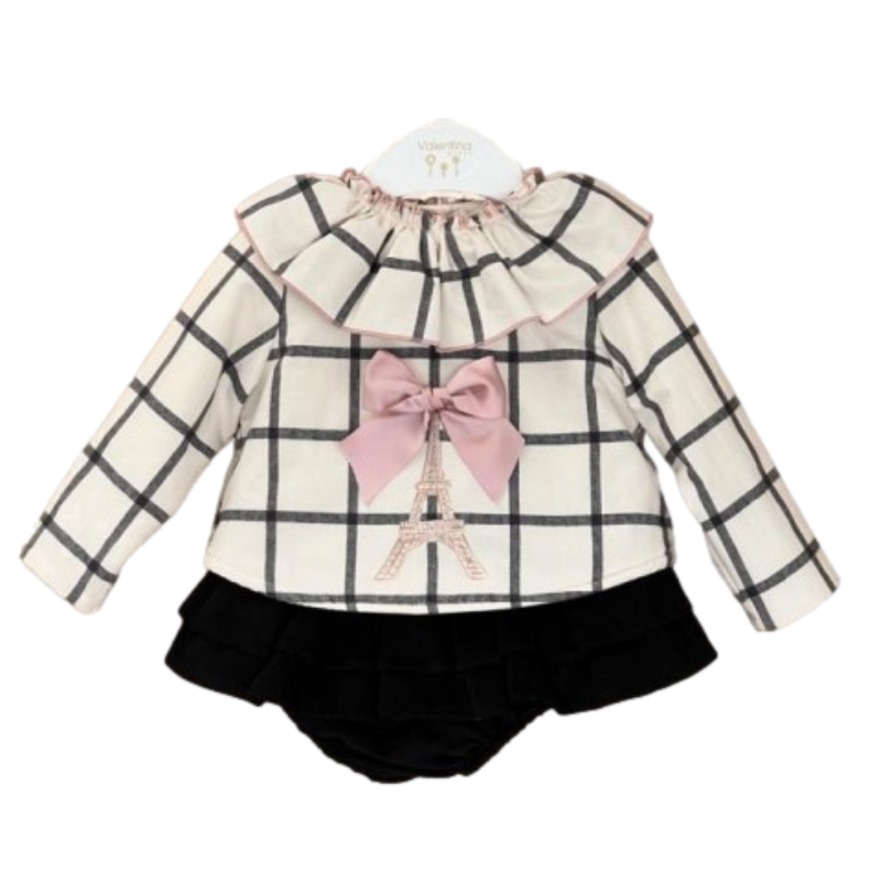 Conjunto da coleção Outono/Inverno da marca Valentina Bebes. Sweat grosso em xadrez cru e cinza carvão com gola grande com babados e forro de lã super confortável para maior calor, decorado com um motivo estampado da Torre Eiffel e laço de gorgorão rosa escuro. O conjunto é completad com um tapa fraldas super macio em camadas.