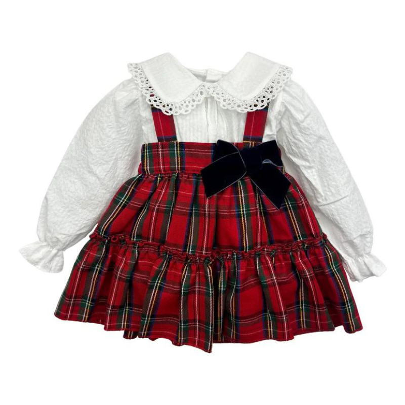 Conjunto de vestido da coleção Outono/Inverno da marca Valentina Bebes. Blusa de algodão com listras brancas de manga comprida e gola arredondada com acabamento em renda divina por baixo do vestido xadrez vermelho decorado com um laço de veludo azul marinho. A roupa é completada com tapa fraldas xadrez a combinar.