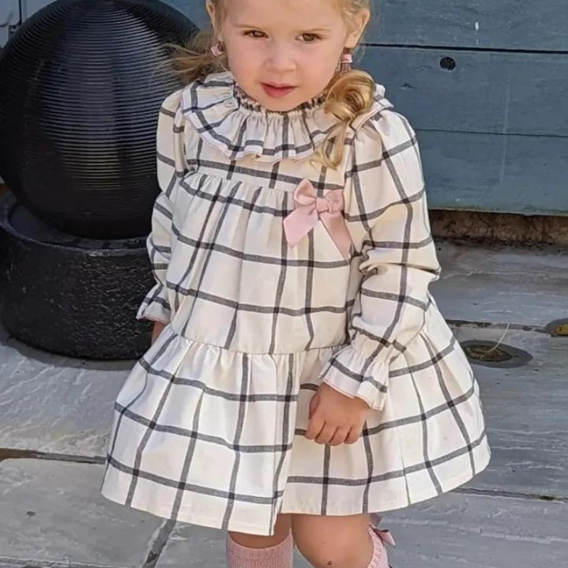 Vestido com tapa fraldas da coleção Outono/Inverno da marca Valentina Bebes. Vestido super macio de algodão cru e cinza carvão xadrez de manga comprida com gola grande com babados, decorado com um laço de gorgorão rosa escuro no peito.